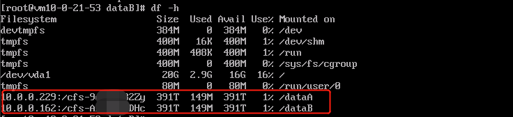 1.在云服务器上创建两个目录 /dataA和/dataB,分别把两个文件系统挂载在对应的目录下。挂载参考链接。