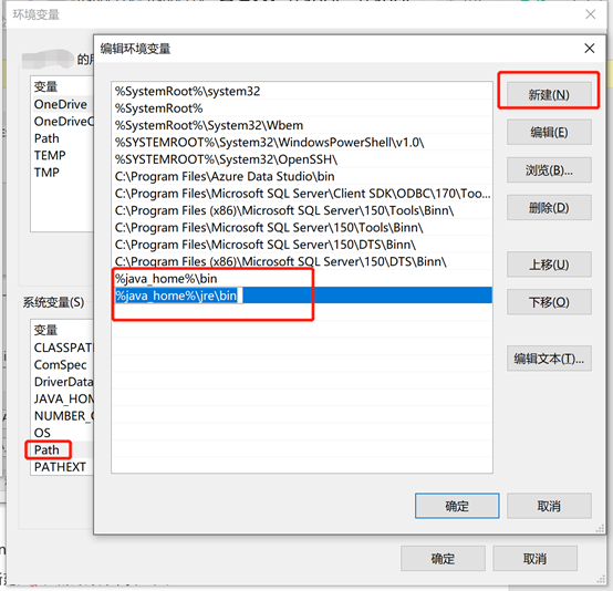 第九步:设置Path属性,双击系统变量中的Path变量,在Path变量中点击新建,将变量值:%java_home%\bin;%java_home%\jre\bin填入: