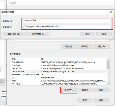 注:变量名单词大写,变量值为在第三步记住的安装路径,如未自定义路径,则为默认路径C:\Program Files\Java\jdk1.8.0_301