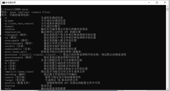 第十步:检查是否安装成功,打开cmd输入javac,如果弹出以下信息则代表环境已配置完成。
