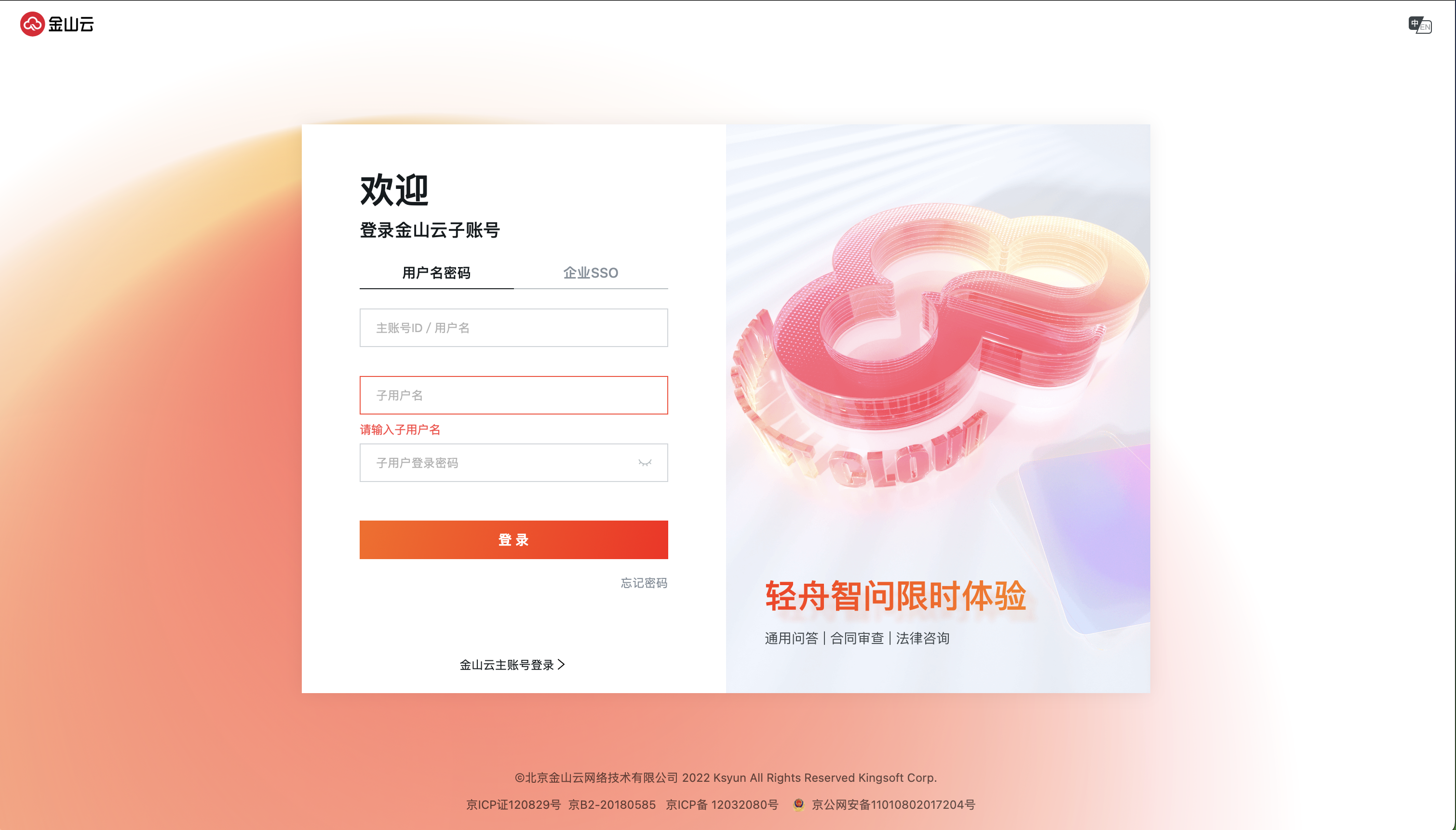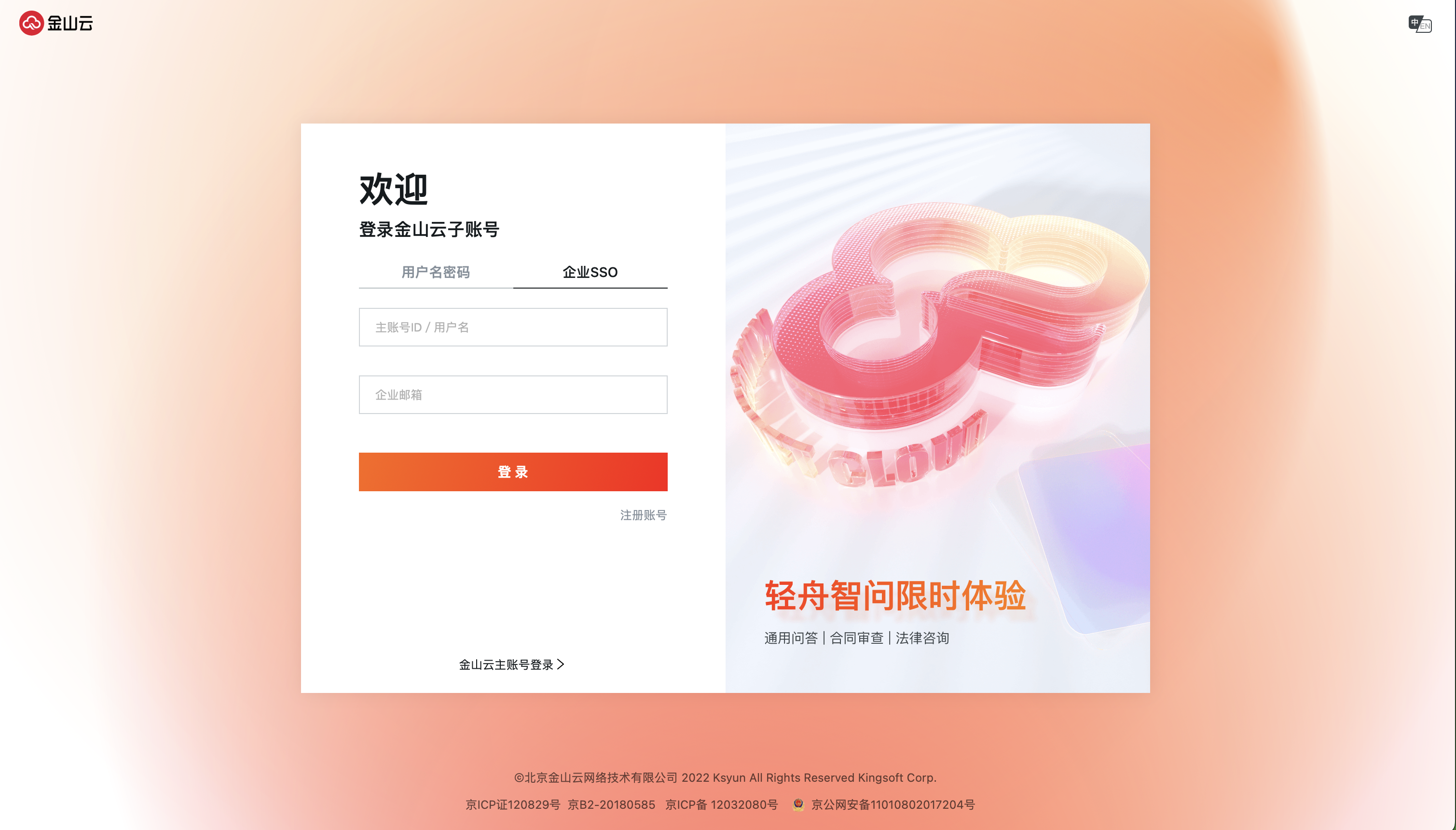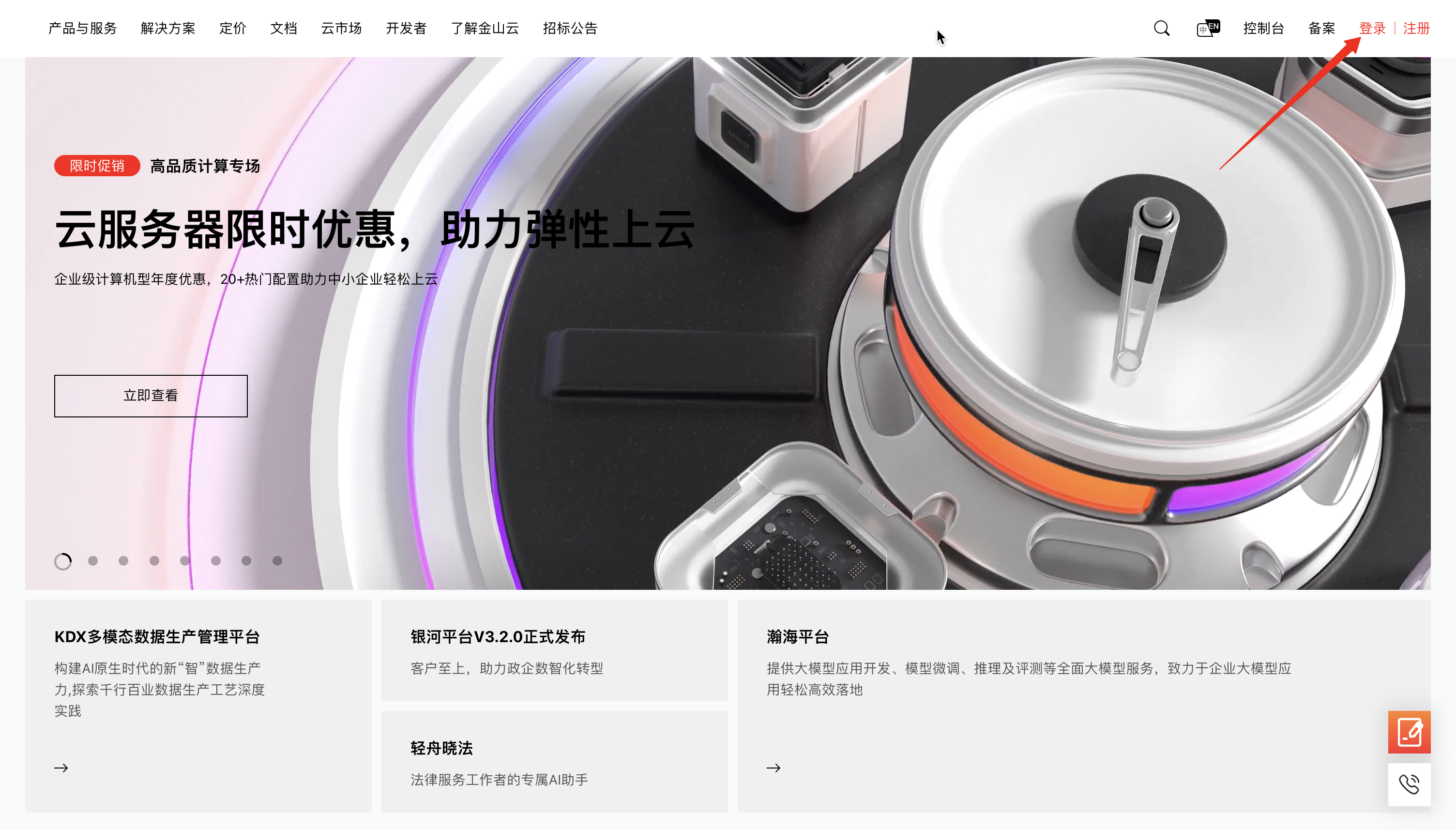 1.访问金山云官网,单击页面右上角 登录 入口,前往登录页面;