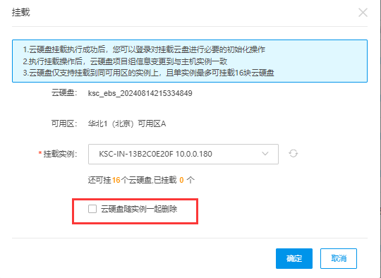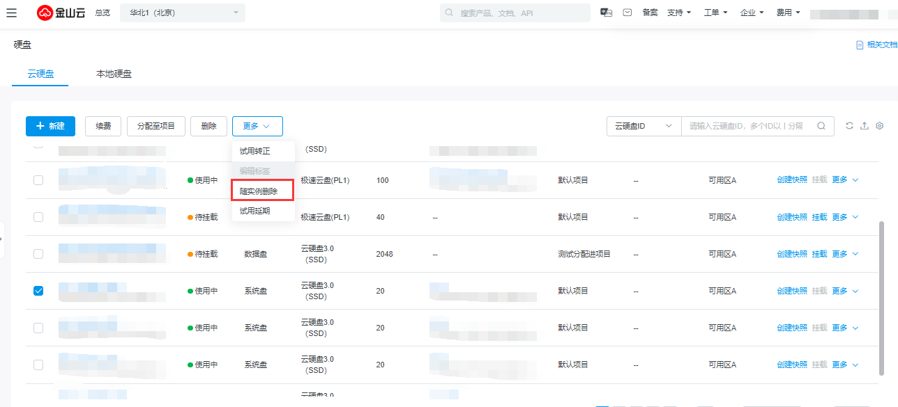 实例上后,每块云盘均默认随实例删除,通过关闭随实例删除,用户可以保留云硬盘。