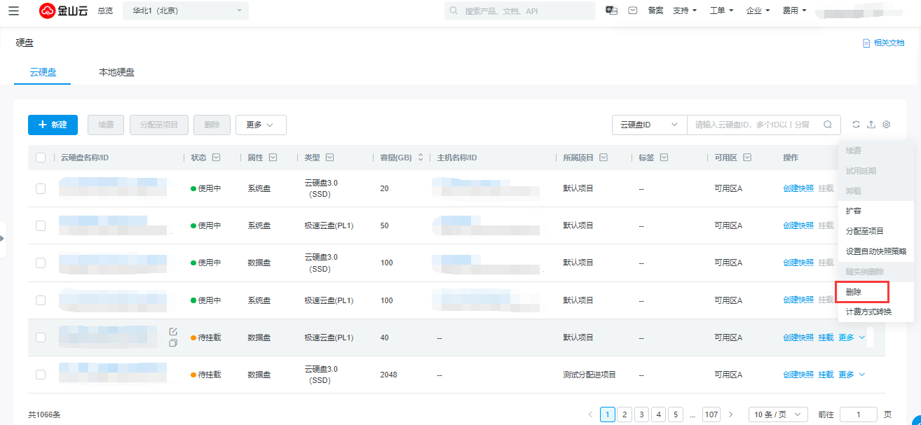 选择单个云硬盘处于待挂载状态,在目标云硬盘对应的操作列中,点击更多>删除。