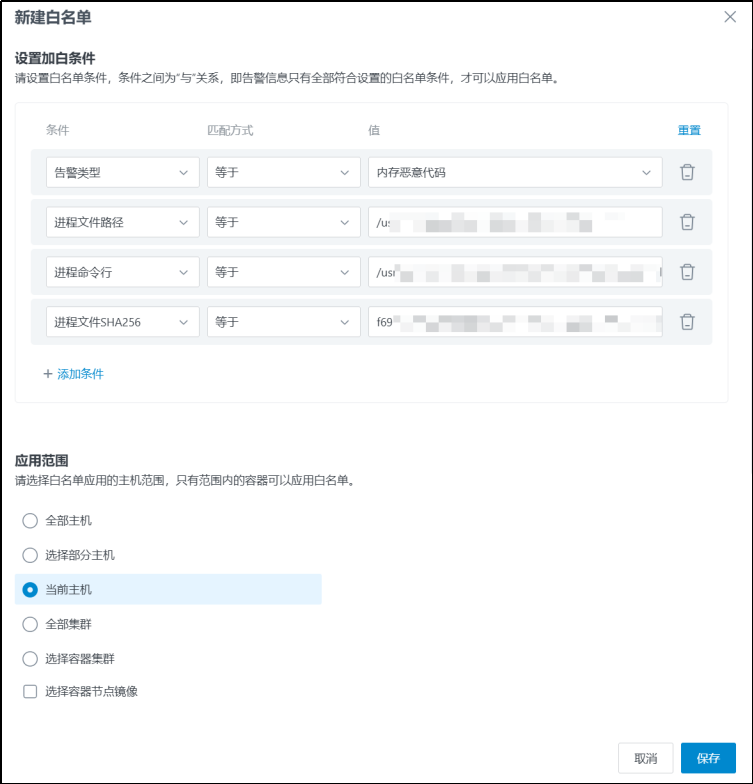 系统将自动填写该条告警的进程相关信息,用户可根据需要重置、添加或删除。重置操作会使加白条件恢复为上一次保存的内容。