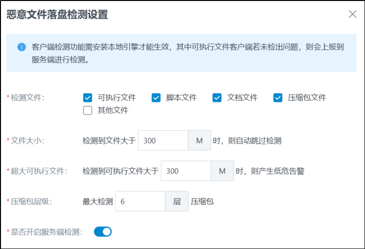 是否开启服务端检测:系统优先使用本地病毒引擎进行检测,当开启服务端检测开关时(默认开启),如果小的可执行文件在本地未检出,将会上传到服务端,使用服务端引擎再进行检测。