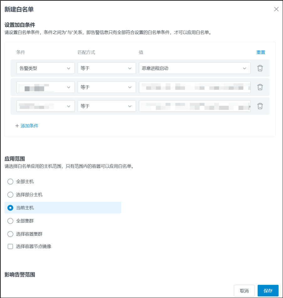 若选择仅影响当前及未来的告警,则白名单只对当前告警和未来新告警生效,历史告警不受影响。