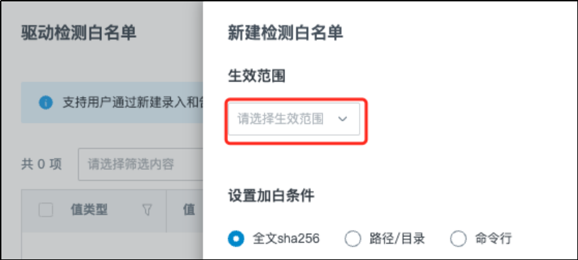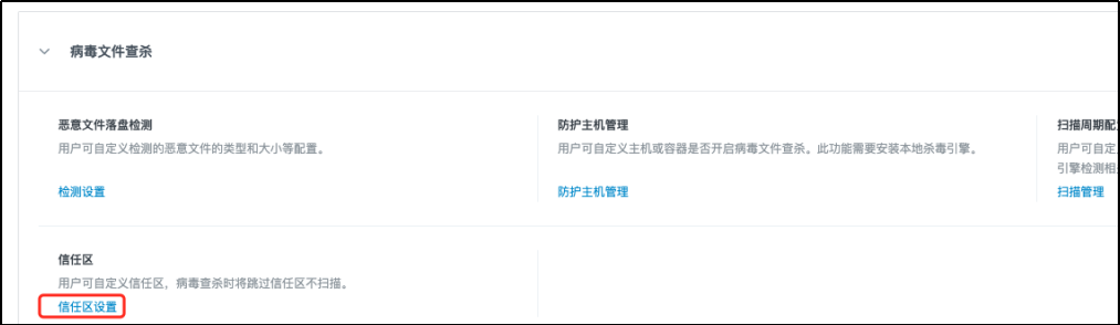 检测配置界面,“病毒文件查杀”下,点击【信任区设置】,可根据文件SHA256、文件后缀、目录等多个维度设置信任条件,满足信任条件的文件或目录,病毒查杀时将跳过不扫描。