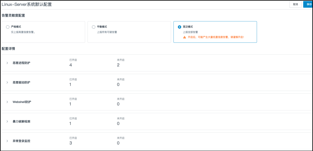 默认配置中可以看到“告警灵敏度配置”,可根据实际情况选择不同的告警灵敏度,建议选择“严格模式”或“平衡模式”,避免产生过多低置信度告警,带来运维负担,系统默认选择“严格模式”。