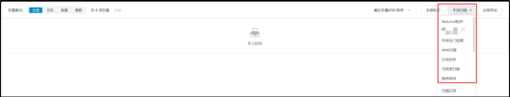 “告警列表”界面,点击表格右上方的“手动扫描”,将显示支持的扫描能力,选择需要的类型,即可创建单次扫描任务。