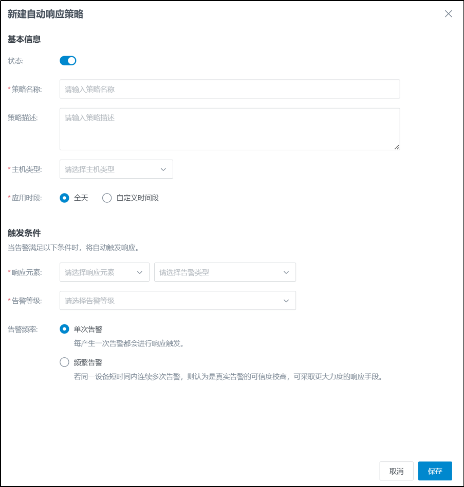 告警频率 | 希望每次告警都进行自动响应,则选择“单次告警”; 担心误报时,则可以设置出现“频繁告警”时再进行自动响应,因为同一台设备频繁出现告警时,则认为是真实告警的可信度比较高,相对“单次告警”,会降低误杀概率。 |