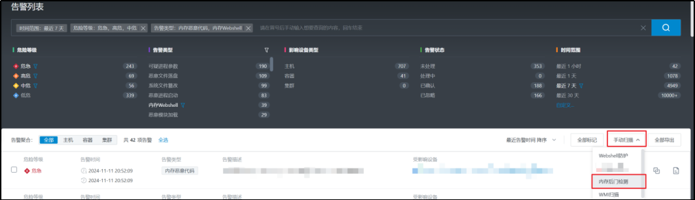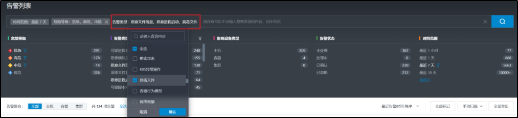 在“入侵检测-告警列表”中筛选告警类型为“恶意文件落盘”、“恶意进程启动”、“病毒文件”的告警信息,可查看病毒相关告警。