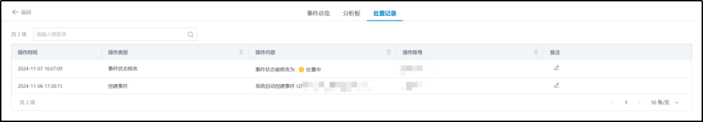 点击事件列表操作栏下的“事件详情”,可进入事件的详情,主要包括事件总览、分析板、处置记录。