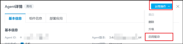 进入探针管理-Agent管理页面,点击Agent列表中的【详情】,在右上角【运维操作】中选择启用驱动。