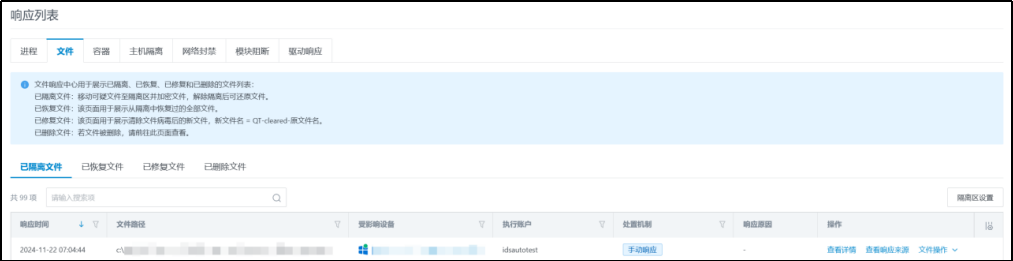 响应列表:记录被成功响应的元素,可对部分响应的元素进行恢复。比如被隔离的文件,可以在“文件”标签下解除隔离,或彻底删除。