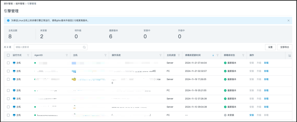 “探针管理-组件管理-引擎管理”界面,点击【设置】,打开自动安装和升级开关,对于后续新安装上线的主机,将进行自动引擎安装。引擎版本更新后,本地病毒引擎也会进行自动更新。