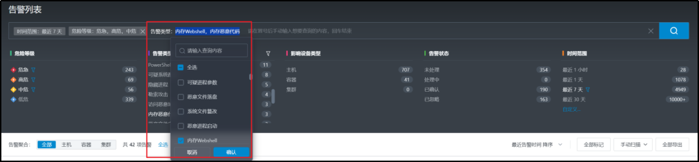 同时,系统支持用户全量或批量导出筛选后的告警数据。