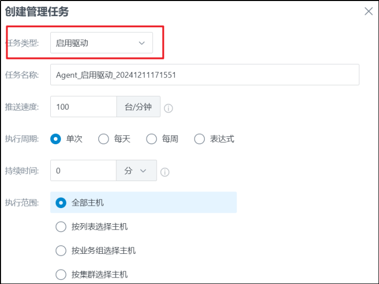方式1:进入探针管理-Agent管理页面,点击,选择任务类型为【启用驱动】,并指定Agent范围。