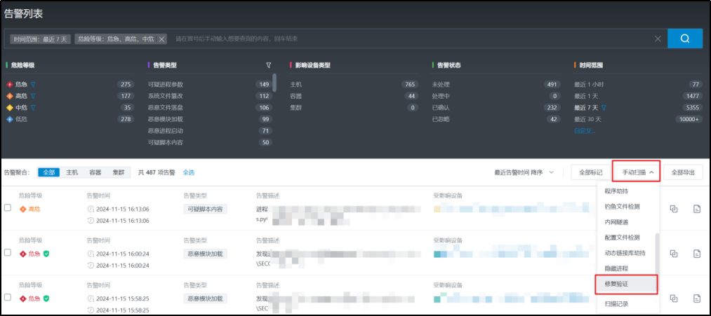 在告警列表中点击“手动扫描”,创建“修复验证”任务。