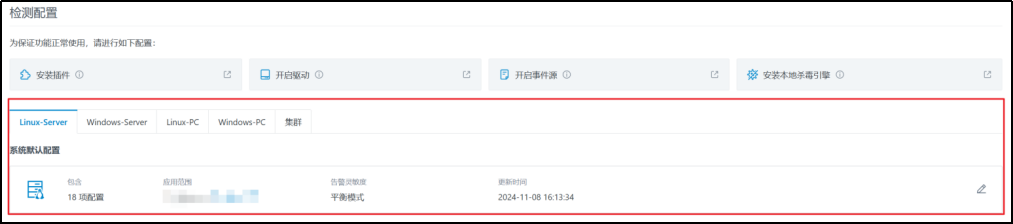 系统根据不同的平台类型,分别提供了默认检测配置,安装探针后,用户无需进行相关配置,也可进行大部分入侵能力的安全防护。部分入侵能力依赖插件、事件源或驱动,需要先进行相关配置后,才可正常防护,比如:Linux进程注入防护需要事先开启audit事件源、ebpf事件源、驱动事件源中的任意一种事件源、Windows进程注入防护需要先开启驱动、可疑命令审计需要安装对应的插件、设备具有的入侵阻断能力需要事先开启驱动等,可通过检测配置界面的说明查看相应的依赖。