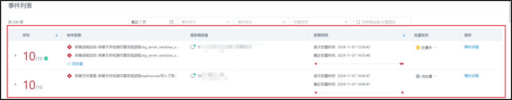 事件列表:由告警聚合而成,是一组关联告警的集合,旨在帮助用户从攻击链的角度去查看黑客完整的一次入侵攻击过程。