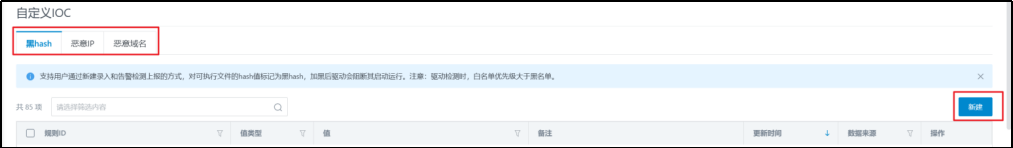 如果用户从威胁情报、真实告警或其他来源获取到黑hash、恶意IP或恶意域名,可进入“自定义IOC”界面,录入这些信息,以便系统及时发现和阻断威胁行为。