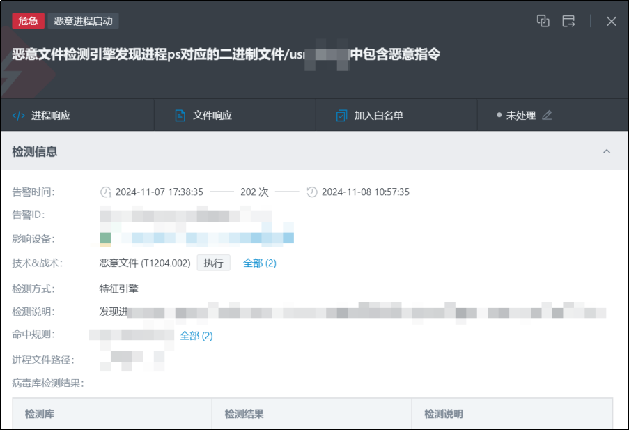 恶意进程启动的告警详情中,展示引擎检测结果,恶意进程对应的文件路径、进程链等信息。