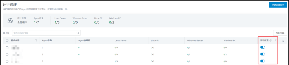 开启驱动总开关。进入租户管理-探针管理-运行管理页面,列表中【驱动配置】一栏代表租户的驱动总开关,只有该开关打开,租户的入侵功能配置等页面才会出现驱动相关配置开关。