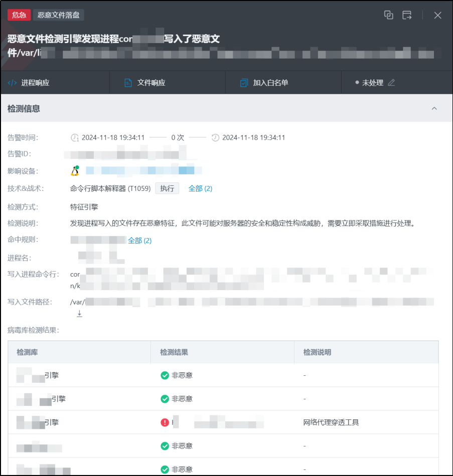 恶意文件落盘的告警详情中,会展示引擎检测结果、恶意文件落盘的位置、由哪个进程执行落盘的、进程链等相关信息。