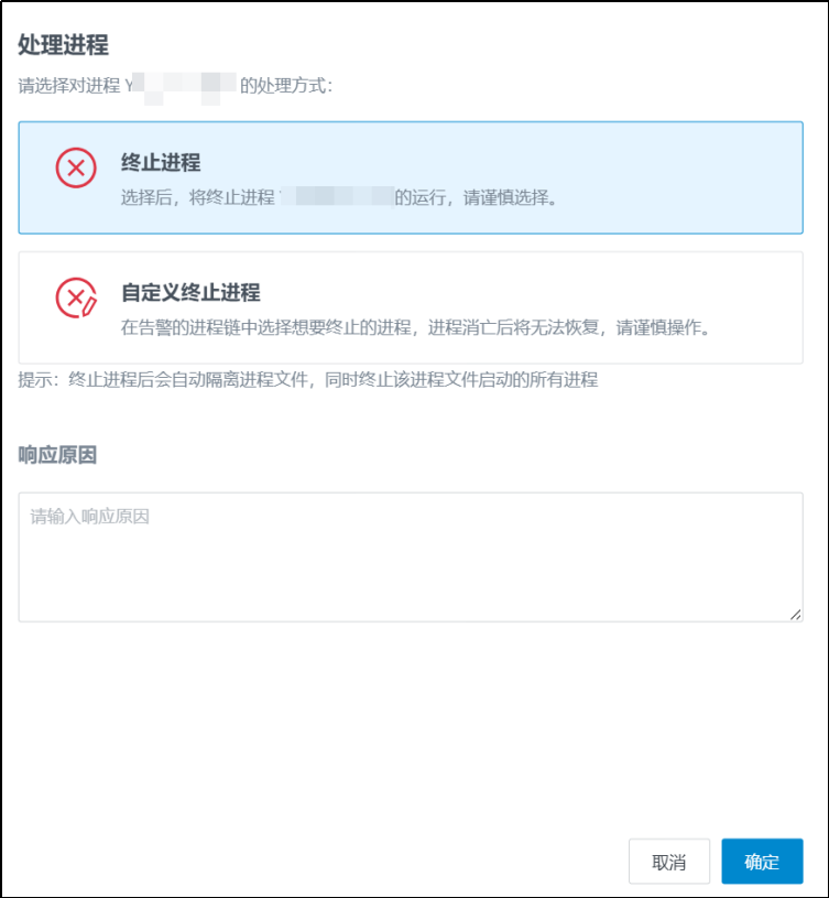 l 自定义终止进程:希望对进程链上的其他进程也进行终止时,可以使用此项功能。比如告警中的进程是恶意进程,其父进程也是恶意的,此时可以将父进程和告警进程一同终止。