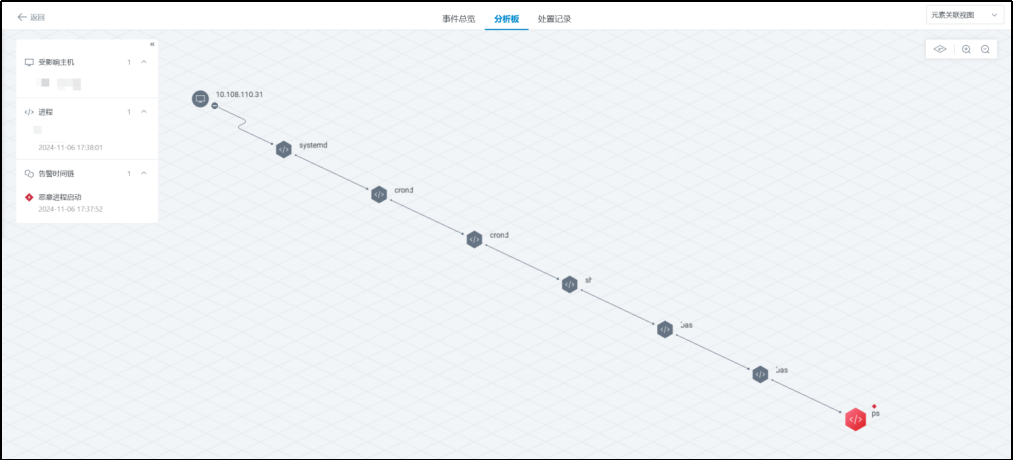 分析板:以进程、文件、注册表等元素粒度,图形化展示该次事件的入侵全过程。
