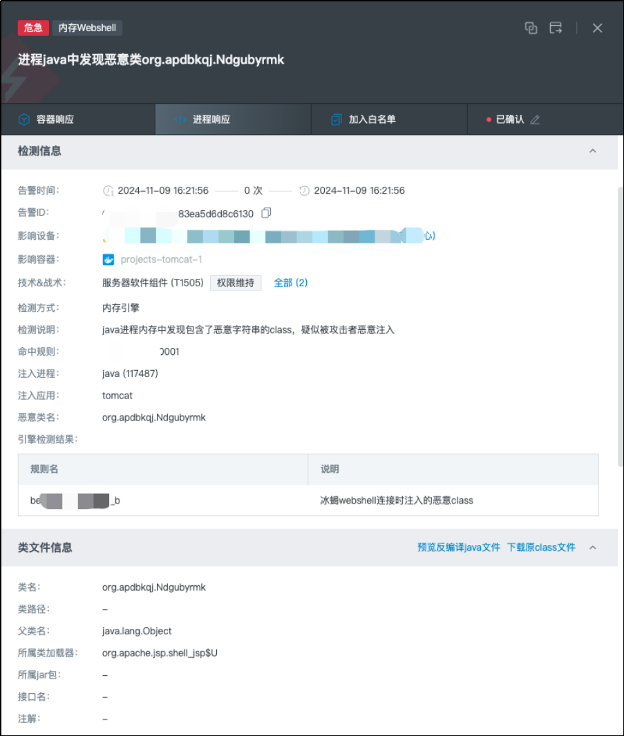 内存webshell告警详情中,可查看被注入的应用及站点信息,可查看被注入的进程及进程链信息,可查看恶意的类名,支持下载class原文件并进行反编译。