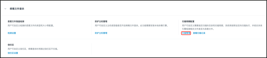 在检测配置页面,配置详情中,找到病毒文件查杀的扫描周期设置,点击“扫描管理”,选择“新建”