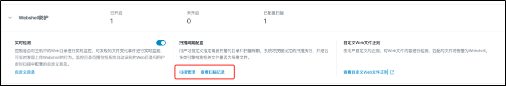 部分入侵检测能力,支持扫描检测,比如Webshell防护,可通过创建扫描任务,对主机中的Web目录进行扫描,检测目录中是否存在Webshell。系统支持单次或定时扫描任务。