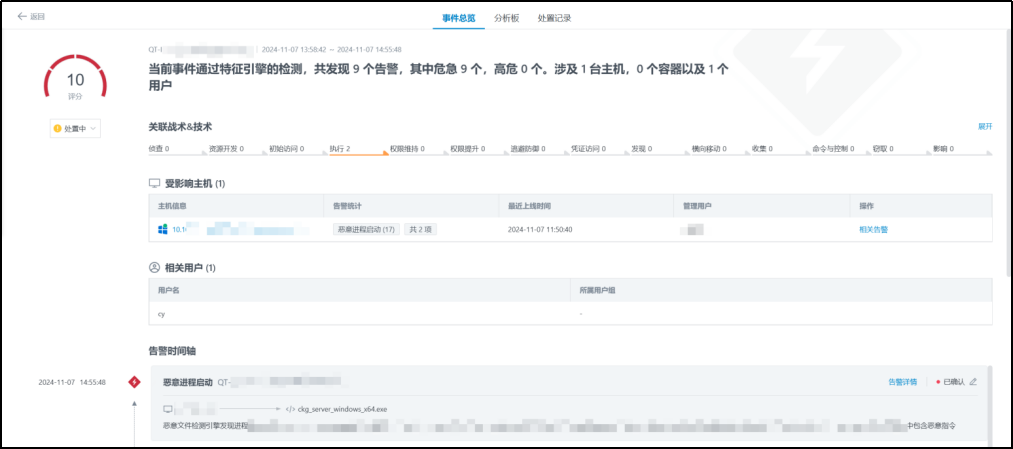 事件总览:展示事件总体信息,比如事件描述、事件评分、事件中用到的战术&技术、受影响主机、告警时间轴信息等。