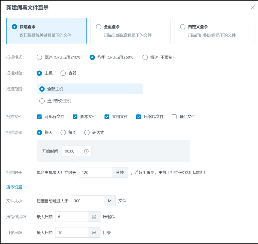 检测文件:指用户希望检测的文件类型。未选中的文件类型将不会进行检测。 文件大小:为防止主机性能过度消耗,用户可设置需检测文件的最大大小。系统默认为300M,当文件大于该数值,则不再检测。