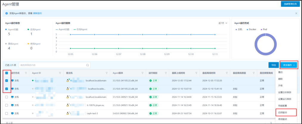 方式2:在Agent列表中,勾选需要开启驱动的Agent复选框,在更多操作中选择【启用驱动】。