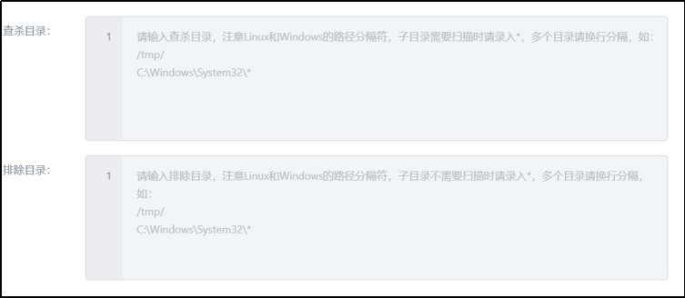 自定义查杀:用户需填写需要查杀的目录和排除的目录,系统将只扫描用户所指定的目录。