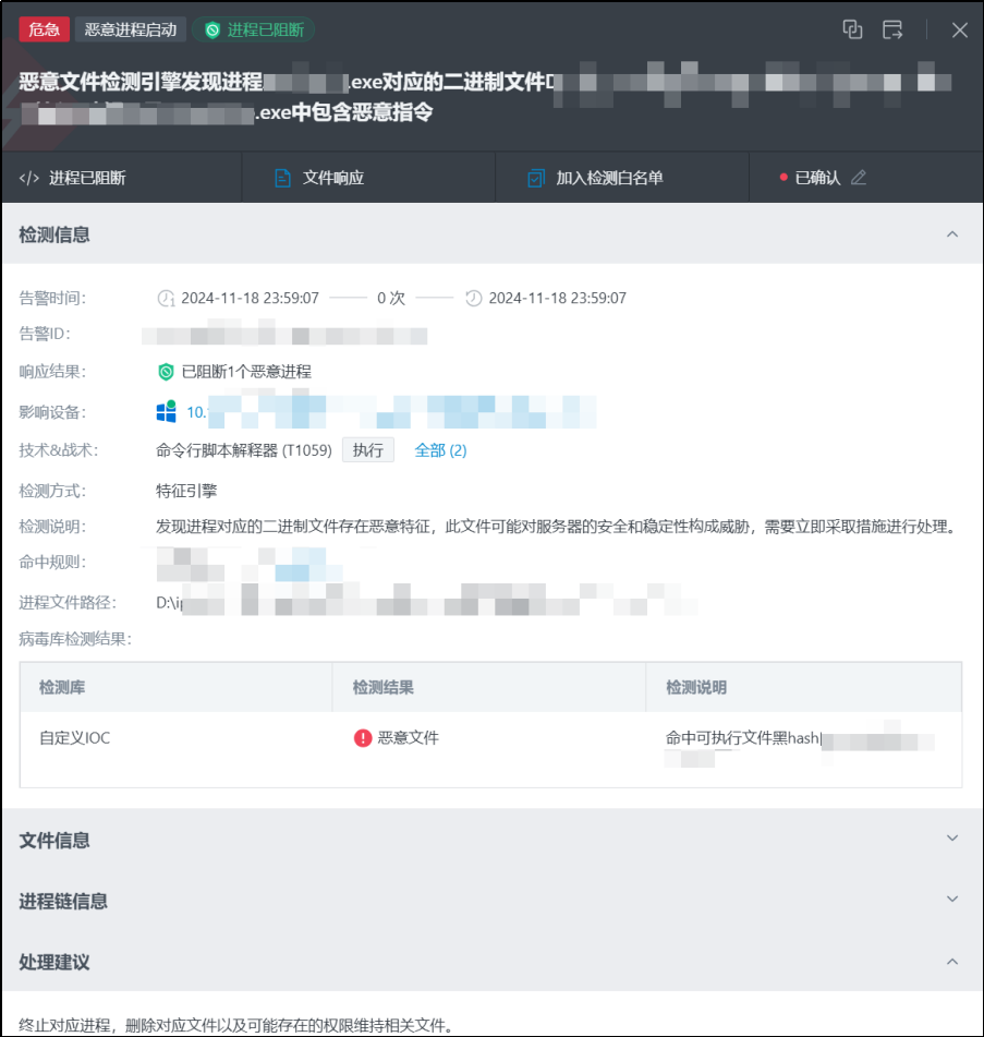 或直接点击告警信息,可查看告警详情,包括告警ID、影响设备、技术或战术、命中内容等检测信息、受影响文件的路径、类型等文件信息及进程名、进程命令行等进程链信息、处理建议等。