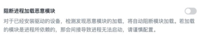 事前响应需要在“检测配置”界面开启响应的阻断开关,且开启驱动。例如检测到进程加载恶意模块时,如果希望禁止进程加载恶意模块,则需要开启相应的阻断开关并开启驱动。
