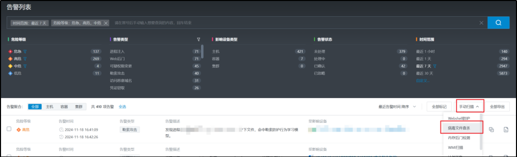 在“入侵检测-告警列表”界面中,点击表格右上方的“手动扫描”,选择“病毒文件查杀”。