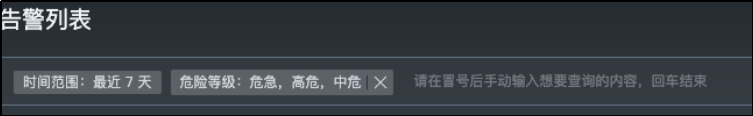 点击进入“告警列表”界面,默认仅展示最近7天的“危急”、”高危“和”中危“告警数据,可从不同维度去筛选和查看相关的告警,仅可查看自己权限范围内的告警。