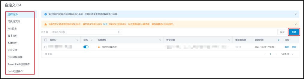 进入“自定义IOA”界面,用户可从进程、文件、可疑命令等多维度进行规则自定义,当命中自定义规则时,系统将上报告警。