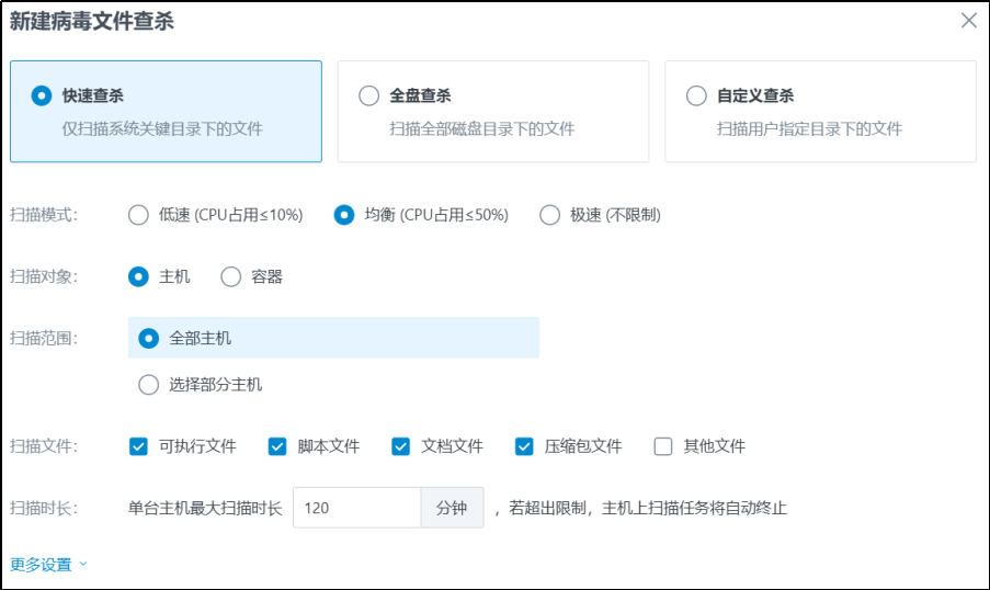 扫描模式、扫描时长:为防止扫描任务消耗过多性能资源,用户可根据实际情况设置扫描模式和时长。