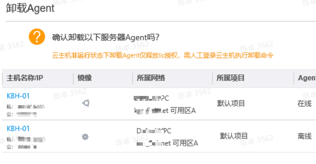 卸载提示:确认卸载以下云主机Agent吗?云主机非运行状态下卸载Agent仅释放lic授权,需人工登录云主机执行卸载命令。