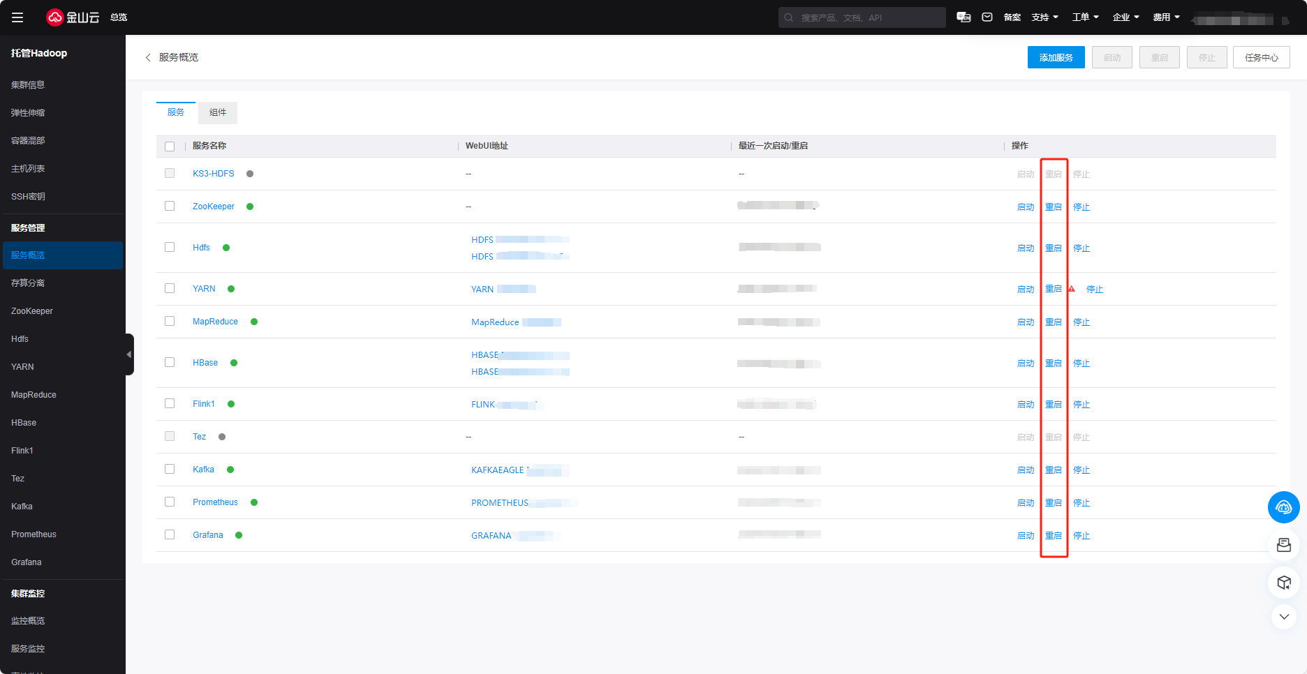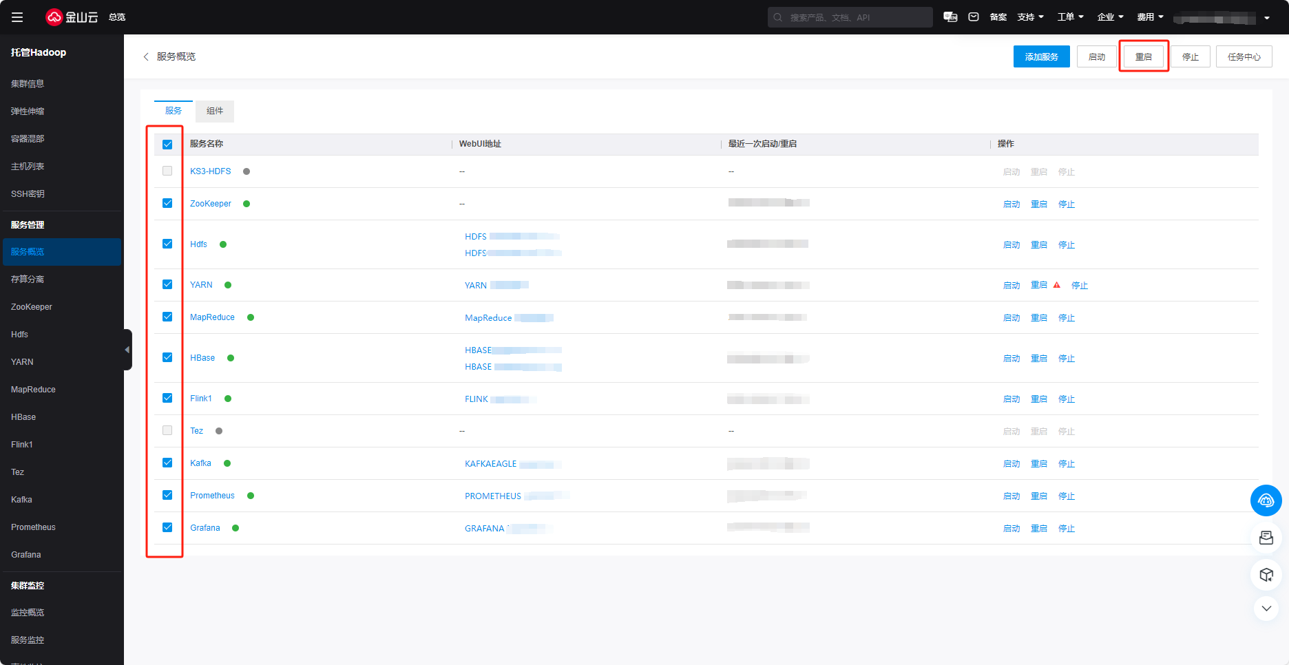 4.通过页面上方重启可对选中的服务进行批量重启。