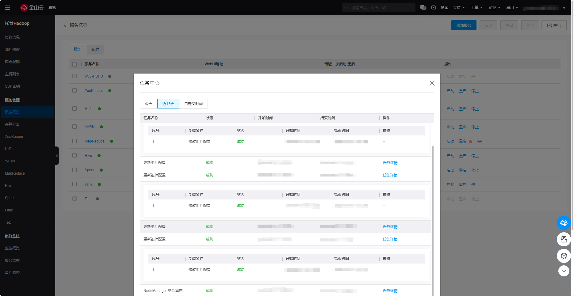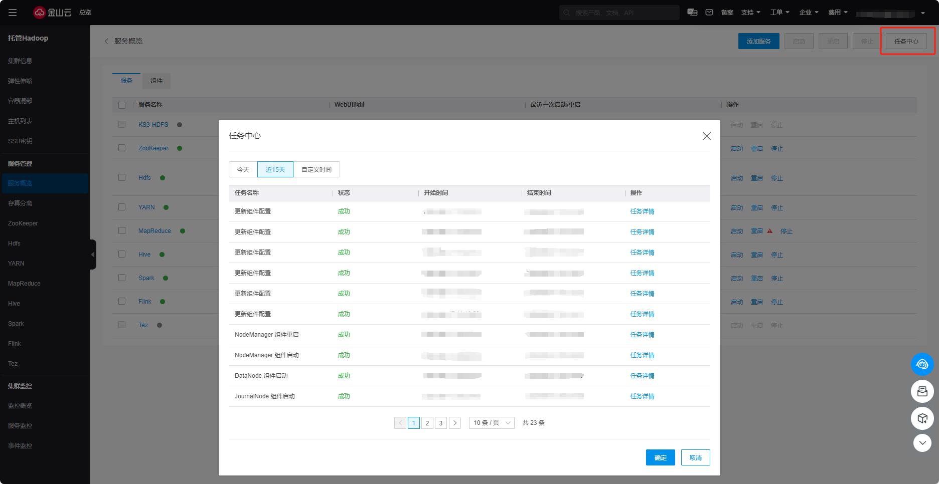 3.在集群详情页面点击页面上方任务中心,任务中心描述的是针对集群的各项操作,该页面展示了操作的任务名称、状态、开始时间、结束时间及操作详情。