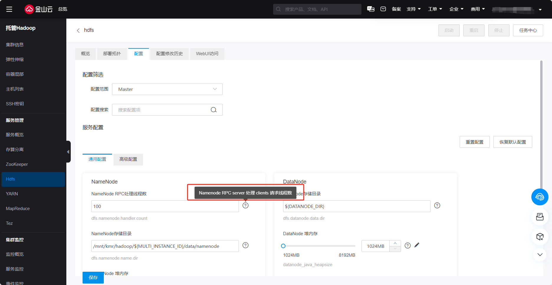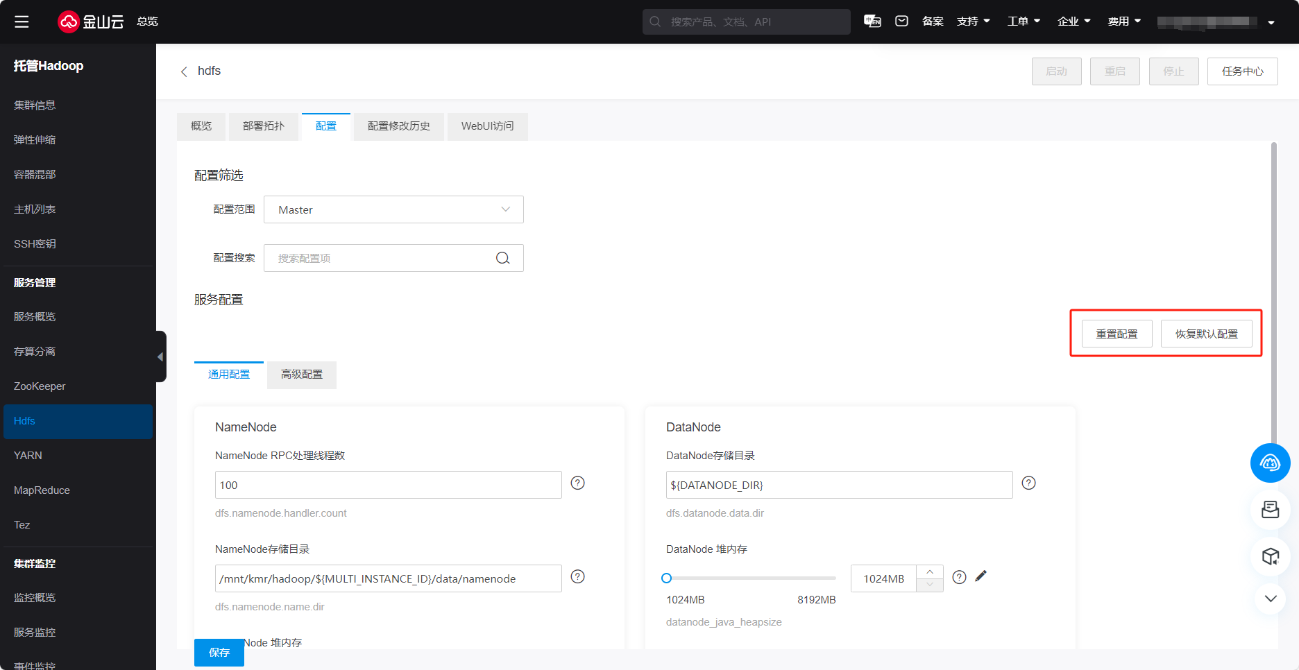 可通过服务配置查看或者管理组件维度配置文件信息,保存配置后,需要重启生效。