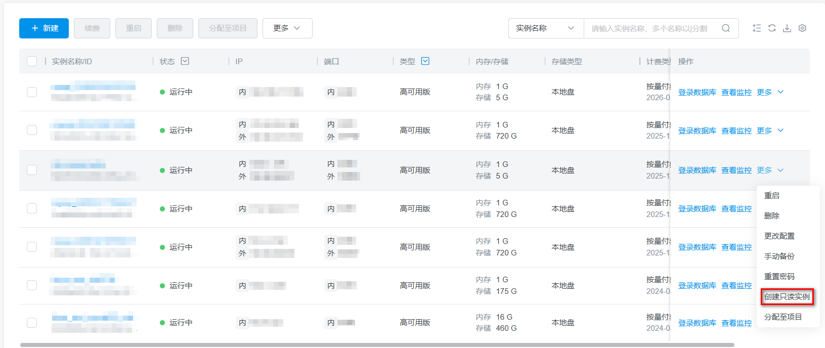 1. 在MySQL实例列表页,选中目标实例,点击实例操作>创建只读实例