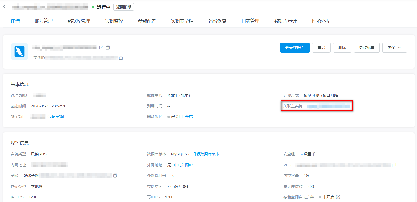 2. 点击只读实例ID,查看示例详情,显示主实例信息。