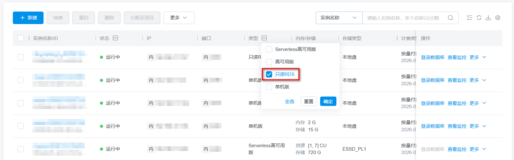 1. 在MySQL实例列表页,类型列选择只读RDS,查看只读实例。